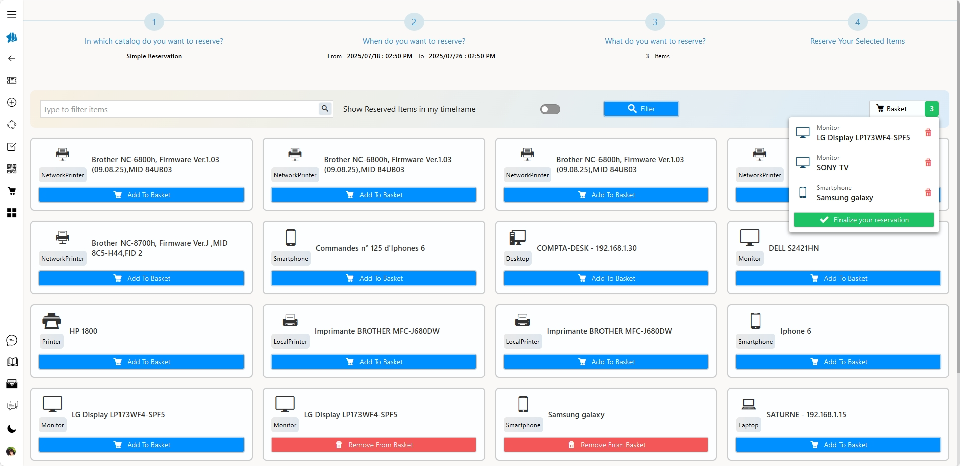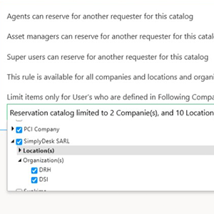 Connecté à vos bases ITAM (équipements) et de localisation (salles), le module exploite vos référentiels existants sans ressaisie. Vous filtrez simplement les ressources à rendre disponibles à la réservation, selon les services, types ou localisations souhaités.