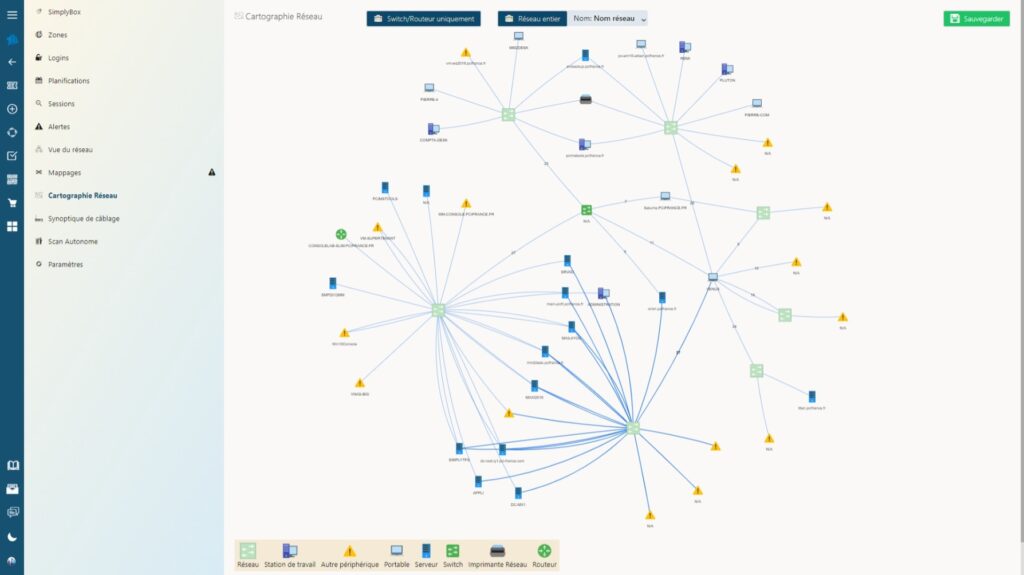 Vue graphique des éléments actifs du réseau avec le détail des équipements connectés sur les ports des switchs et liens avec les prises réseau.